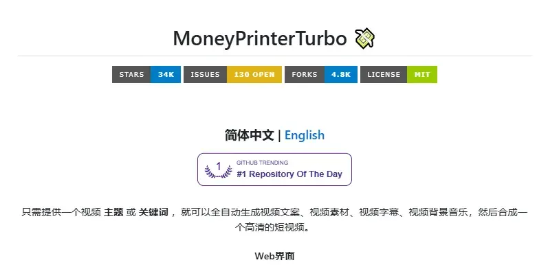 MoneyPrinterTurbo是一款一键AI速成高清短视频的利器,旨在简化短视频制作流程。用户只需输入视频主题或关键词,即可全自动生成包含文案、素材、字幕和背景音乐的高清短视频。这款工具不仅适用于内容创作者,还适合教育工作者、企业营销人员等需要快速制作高质量视频的用户群体。