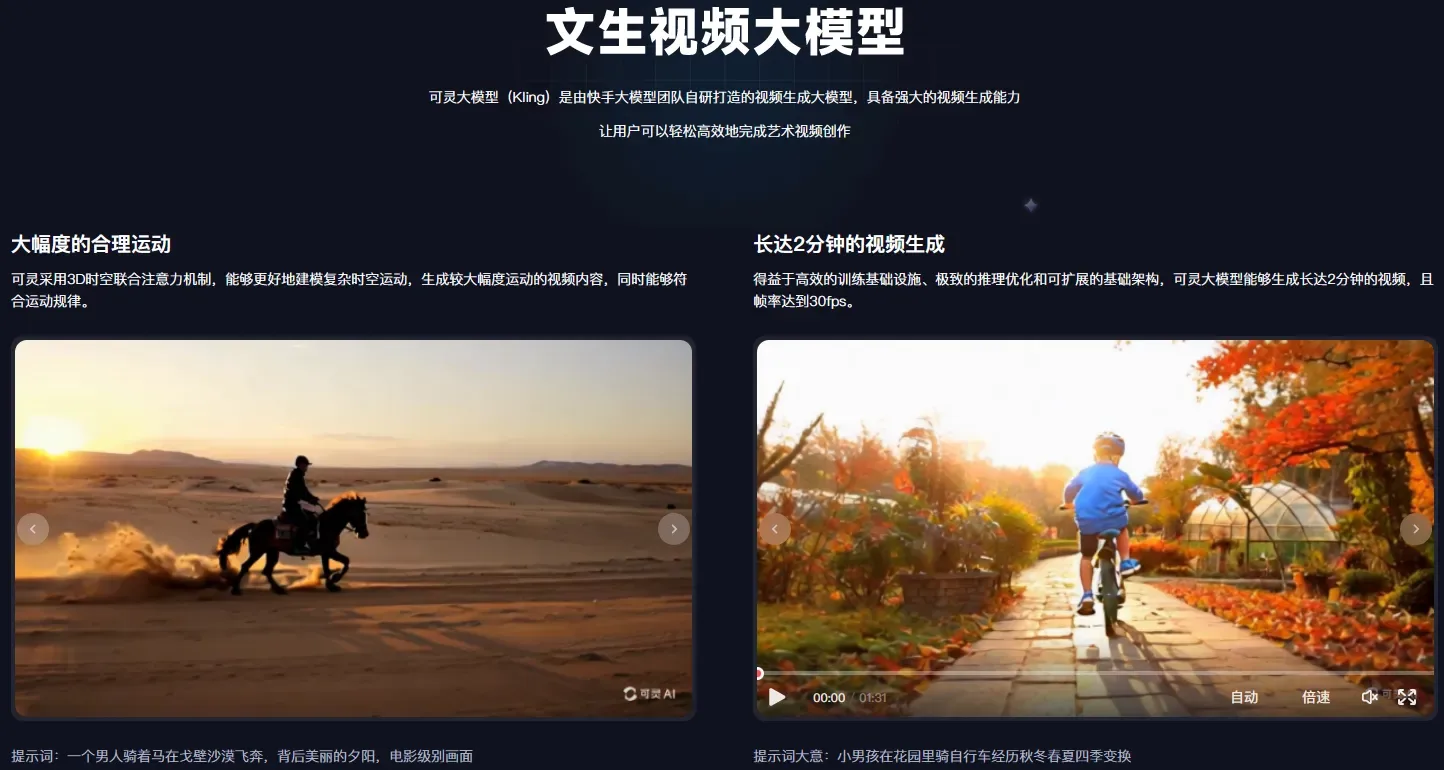 高分辨率和时长的视频生成:可灵大模型支持生成高达1080p分辨率、时长高达2分钟(帧率30fps)的视频,满足高质量视频内容的需求