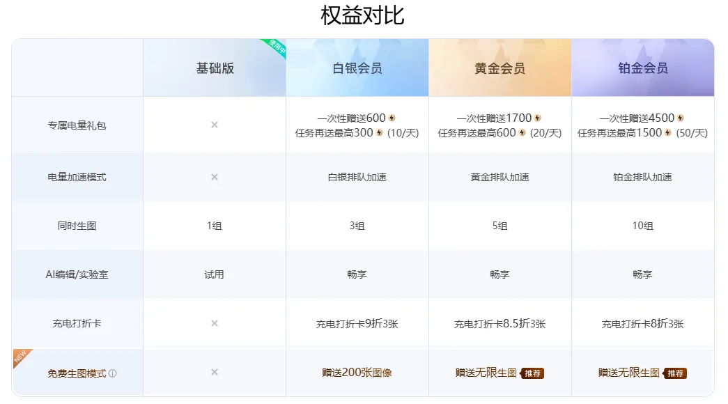 以下是百度文心一格的基础版、白银会员、黄金会员、铂金会员的权益对比图,使用者可以看下