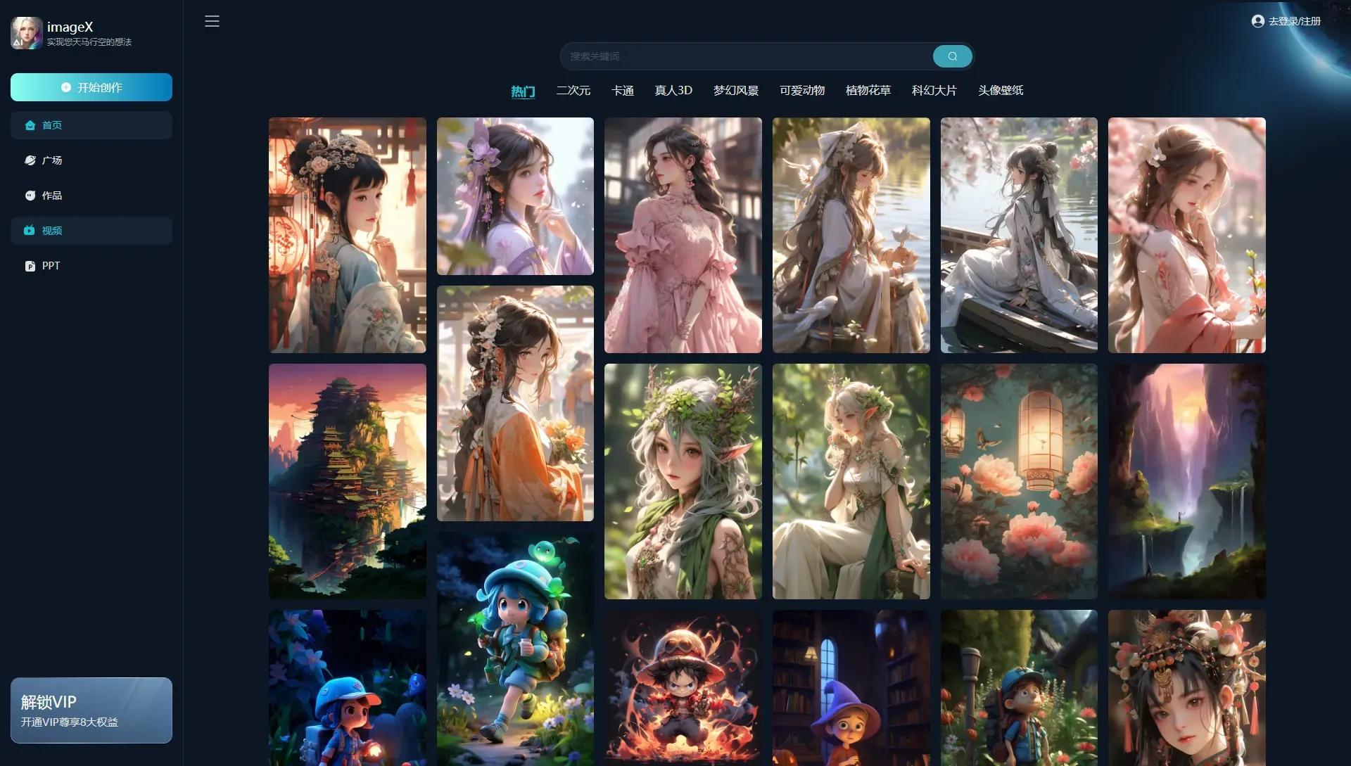 作为一款功能强大的智能绘图工具,imageX提供了丰富的图片风格供您选择,包括但不限于:真人漫画、国风华服、二次元、水粉、真人3D、赛博朋克、概念艺术等。只需轻松输入文字,人工智能艺术便能为您带来不同风格的图片生成器效果。