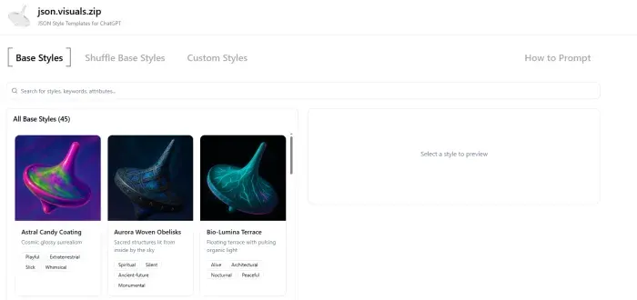 50+美学代码:JSON Visuals for ChatGPT提供了超过50种预定义风格,如赛博朋克、复古像素、超现实主义和荒诞科技风格等,满足了用户多样化的创作需求。