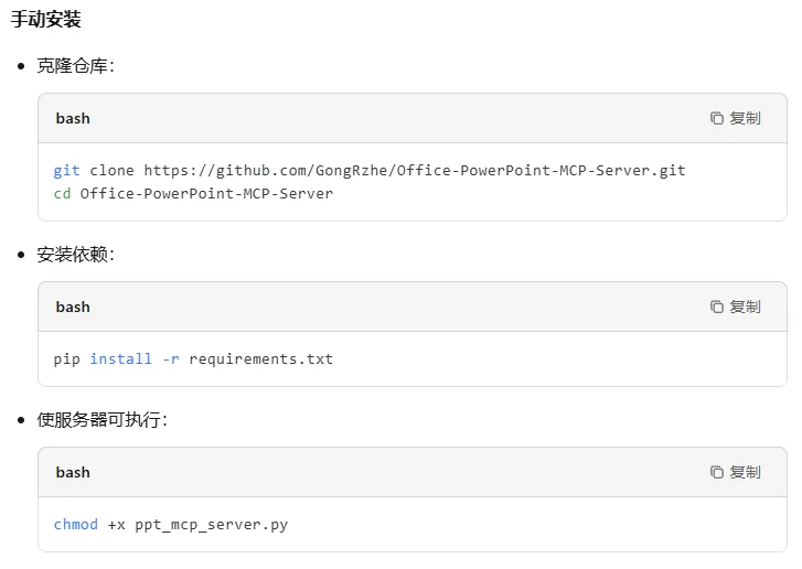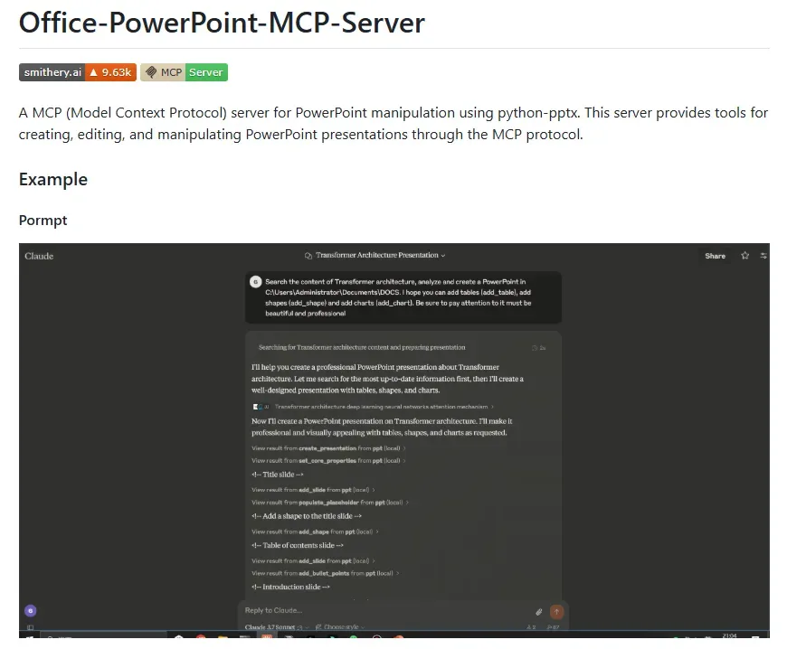 MCP协议集成与AI助手(如Claude、Cursor)无缝对接,通过自然语言指令完成复杂操作,降低使用门槛。例如,用户可通过自然语言描述需求,工具自动完成PPT创建和调整。