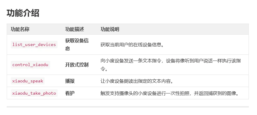 小度MCP Server构建了“设备控制”与“场景联动”双核心服务体系:
