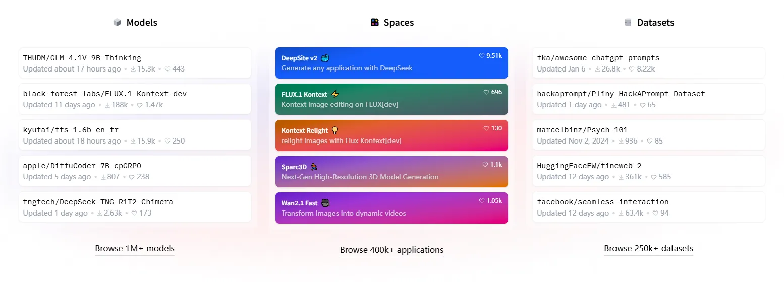 推理API允许用户仅用几行代码,就能将Hugging Face平台上的模型便捷部署,从概念验证到小规模项目,再到大规模生产应用,都能提供稳定可靠的模型推理服务。Hugging Face Spaces则是一个极为友好的环境,用户可在此轻松构建Web应用程序、托管项目演示,并与社区成员展开深度协作,即便是对Web开发不太熟悉的AI开发者,也能借助它快速搭建出可视化的AI应用展示界面,分享自己的创意与成果。