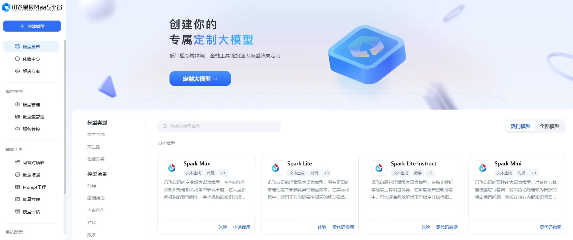 模型丰富:讯飞星辰平台已汇集讯飞星火、Llama3、SD-XL等20多个行业内知名的优质模型,包括新加入的Spark Max、Spark Mini、Spark Tiny等星火自研模型,以及书生系列、Qwen2.5系列等多个开源模型的精调版本,满足用户在不同场景下的需求。