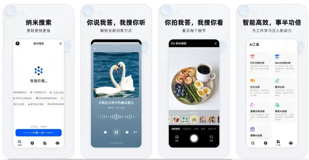 多维交互: 纳米搜索支持文字、语音、拍照、视频等多种搜索方式,满足不同场景下的搜索需求。
