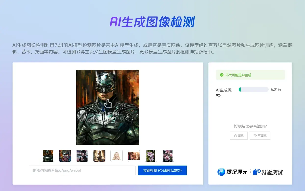 腾讯朱雀实验室上线的这款AI生成图片与文章鉴别工具-朱雀大模型检测,是一款基于深度学习和自然语言处理技术的智能检测平台。它通过对上传的图片和文章进行深度分析,捕捉真实与AI生成内容之间的差异,从而实现对AI生成内容的准确鉴别。