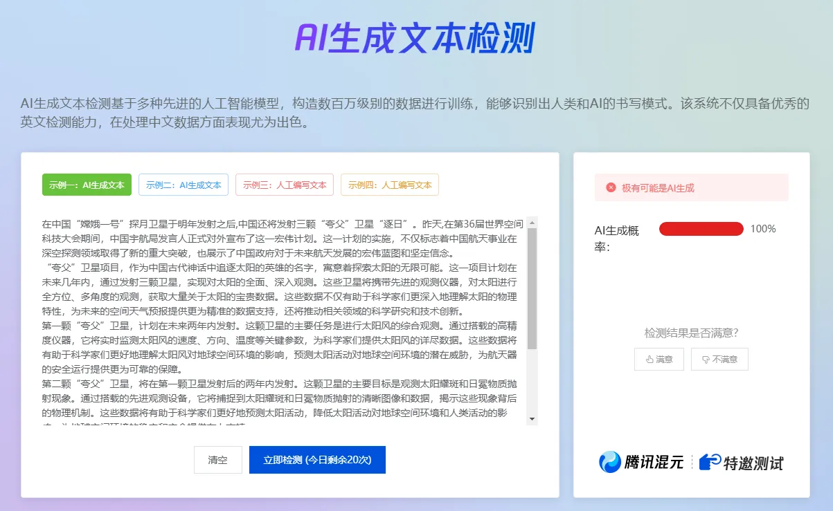 文章鉴别:除了图片鉴别外,该工具还能对文章进行AI生成检测。它利用自然语言处理技术,分析文章的写作风格、句子结构等特征,判断文章是否由AI生成,涵盖了新闻通讯、公文、小说、散文等多种文体。