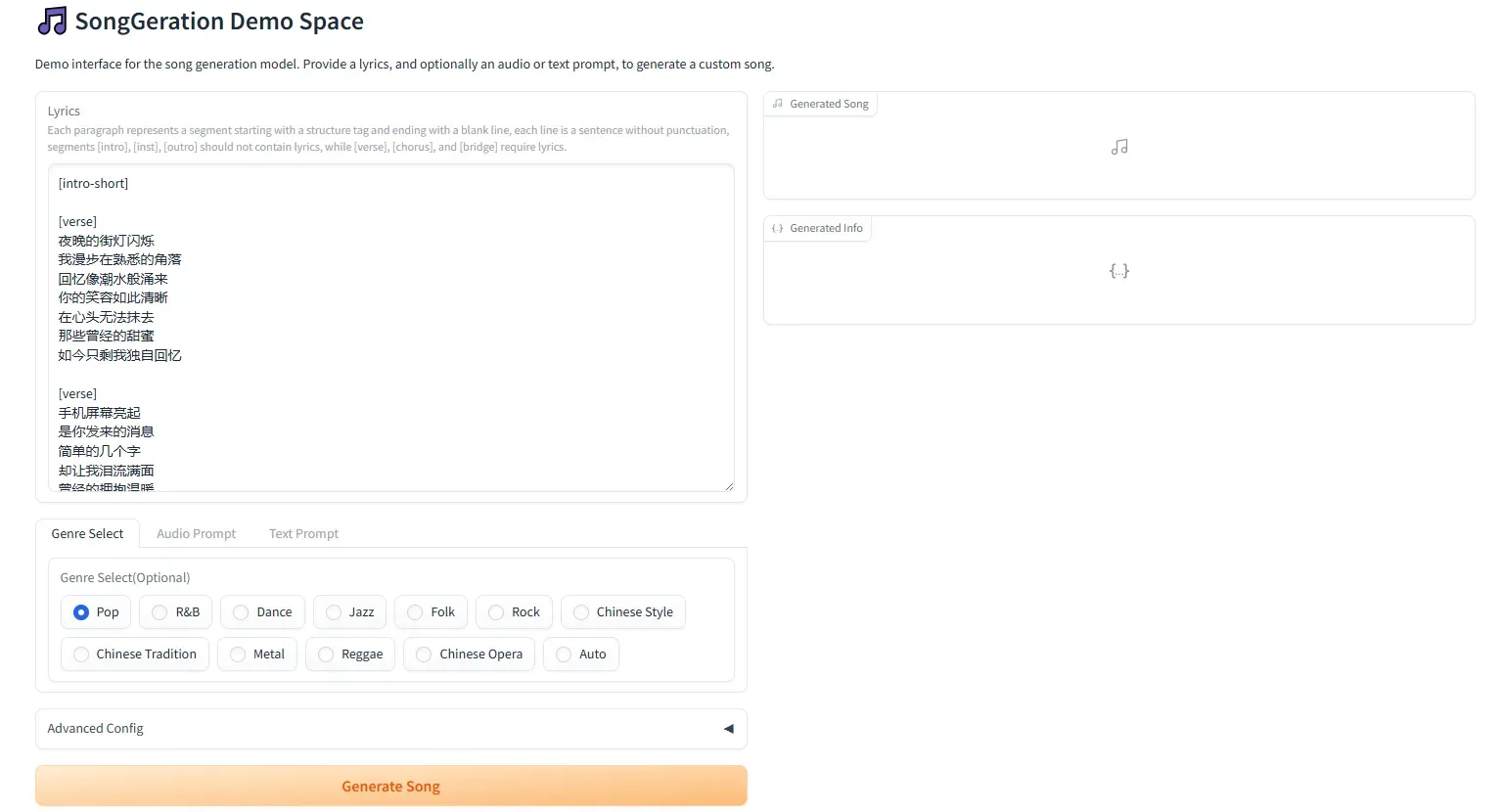 文本控制:用户只需输入关键词文本,如“开心 流行”“激烈 摇滚”等,SongGeneration即可基于输入文本生成高质量的完整音乐作品。这一功能使得用户能够轻松地根据自己的需求和创意,快速生成符合特定风格和情绪的音乐。