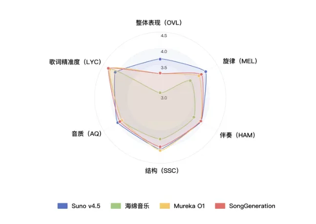 生成速度优化:基于LLM-DiT融合架构,SongGeneration在保持生成速度的同时,显著提升了音质表现,生成歌曲的准确度相较部分商业闭源模型表现出相当甚至更优的质量,同时在整体表现、旋律、伴奏、音质与结构等维度也优于现有多数开源模型。