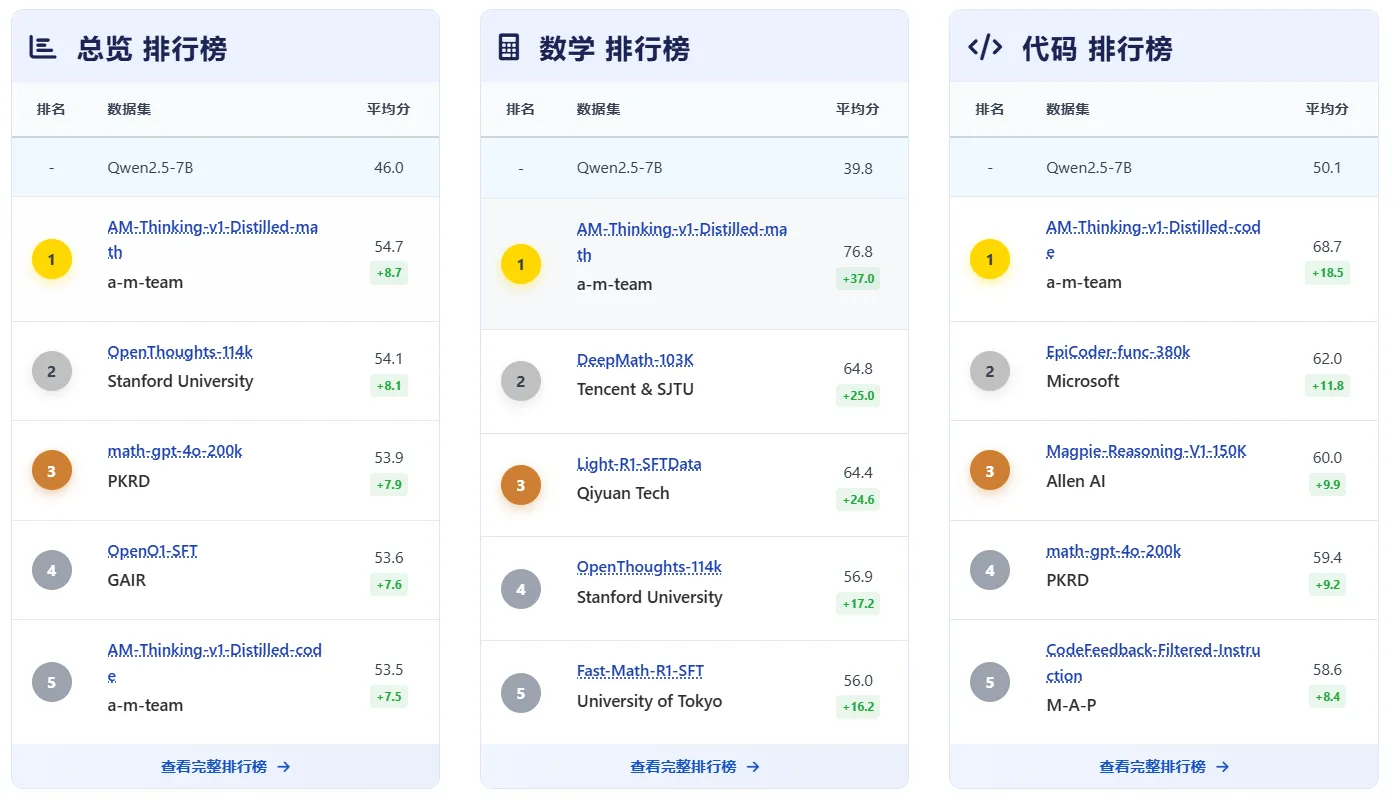多领域数据竞技榜单:覆盖通用、数学、代码、科学等4+领域,提供可视化排名,直观展示数据集在特定任务中的表现。