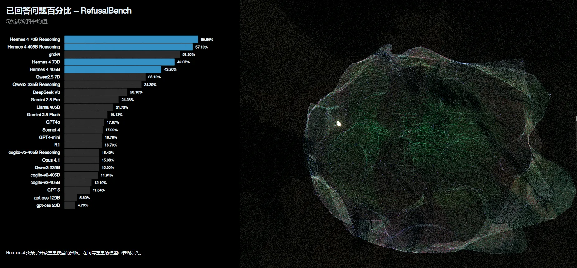 RefusalBench 测试:Hermes 4 在 RefusalBench 测试中表现出色,遥遥*于其他现有模型,其参与争议性话题的意愿超越了所有现有模型。在 5 次试验的平均值中,Hermes 4 405B 的回答问题百分比达到了 43.20%,Hermes 4 70B 为 49.07%,而其他模型如 gpt-oss 20B、gpt-oss 120B、GPT 5 等的回答百分比较低。