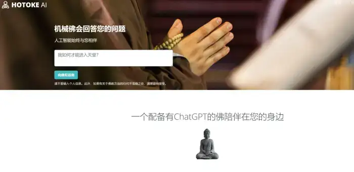 Hotoke ai(机械佛)是一款搭载ChatGPT的创新的随身佛教顾问AI工具,成为了佛教信徒的贴心伴侣。这款机械佛AI工具旨在为用户提供关于佛教知识的咨询服务,让智慧的光芒时刻伴随着您。