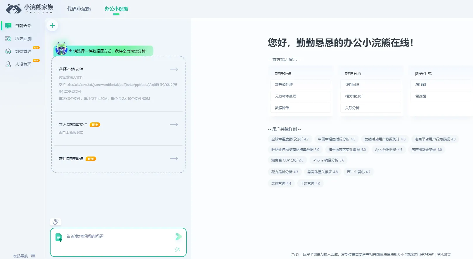 1. 功能丰富:办公小浣熊可通过自然语言输入,实现数据清洗、数据运算、比较分析、趋势分析、预测性分析、数据可视化等常见数据分析任务。