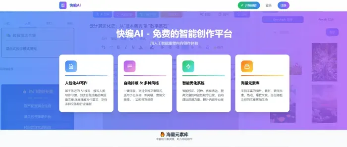 快编AI是一款集智能写作、素材收集、内容优化于一体的综合性写作助手。它利用先进的人工智能技术,结合大数据分析和自然语言处理技术,为用户提供、便捷的内容创作体验。无论是撰写文章、设计文案还是产生创意内容,快编AI都能为用户提供的帮助和支持。