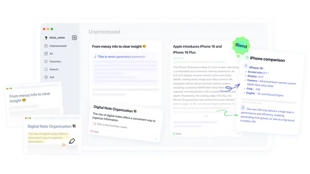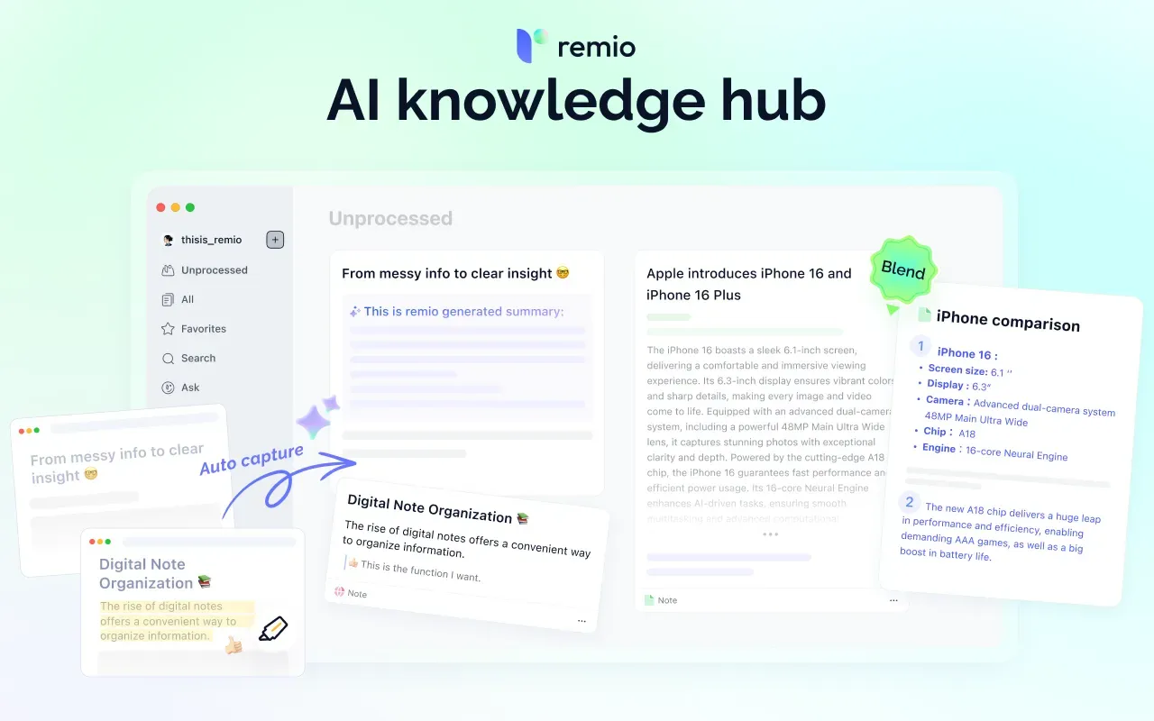 remio睿妙笔记通过AI技术重新定义了个人知识管理的工作流,从信息捕捉到知识输出,全程智能化辅助。无论是学术研究、商业分析还是内容创作,remio都能帮助用户提升效率、聚焦核心价值。在信息过载的时代,选择remio,让知识管理更、更智能。