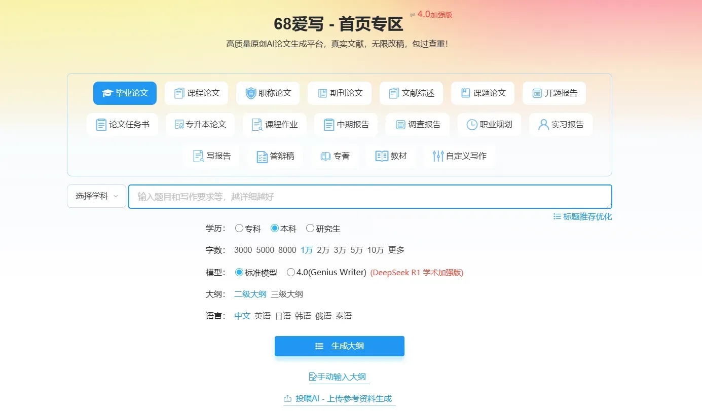68爱写AI论文是一款基于深度学习与学术垂直领域大模型的智能写作平台,专注于解决论文写作中的三大痛点: