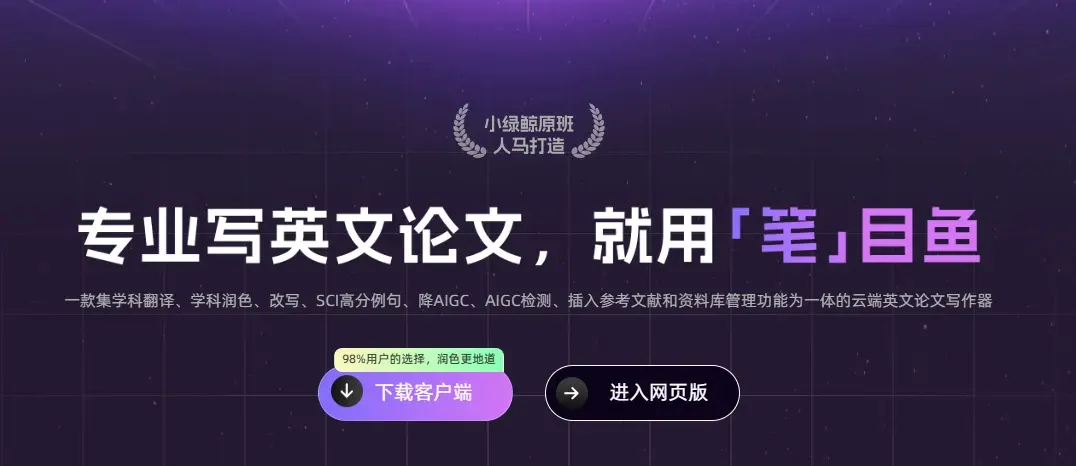 笔目鱼由小绿鲸团队研发,一款专为科研人员设计的云端英文论文AI写作神器,专业写英语论文,基于鲸灵AI科研大模型构建,覆盖113个一级学科,整合超1亿篇高影响因子期刊文献和30亿条语料数据。其核心设计理念是“一站式解决科研写作痛点”,通过三屏协同界面(写作区、翻译区、润色区)实现“边写边翻边润”“边写边搜语料”“边写边插参考文献”的沉浸式写作体验,避免多软件切换导致的效率损耗。