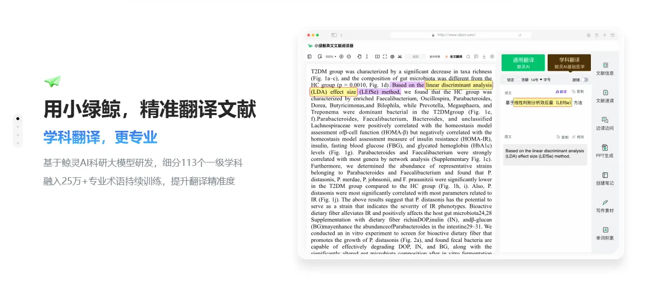 对于非英语母语的科研人员来说,英文文献中的专业术语和复杂句子常常让人望而却步。小绿鲸的鲸灵AI学科翻译功能分为基础版和pro版,基于鲸灵AI科研大模型研发,细分113个一级学科,融入了25万+专业术语,能够根据不同的学科特点进行翻译,让翻译结果更加符合专业要求。而且,它内置了10大翻译引擎,支持deepseek、ChatGpt等10种翻译引擎自由切换,无论是日常阅读还是专业研究,都能找到最适合的翻译方式,满足多种翻译场景的需求,翻译更加灵活多样。