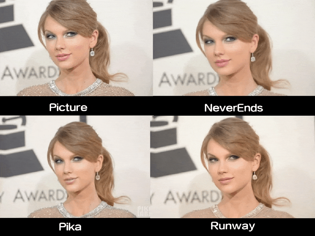 测试小结:NeverEnds十分优秀地保持了人物真实性,视频里的霉霉兼具各种小表情,缺点是视频有点抖。Pika和Runway倒是很稳,但最大的问题是完全不是霉霉。
