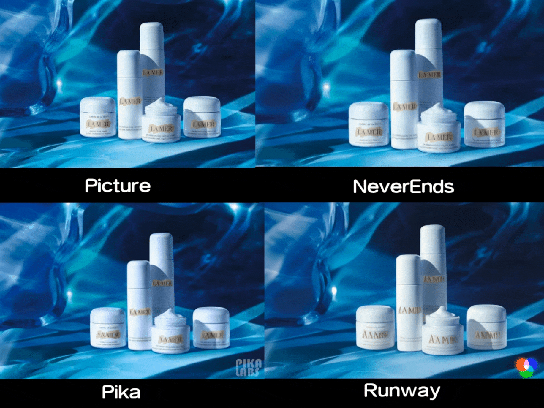 测试小结:NeverEnds在商业广告中同样表现优异,在确保稳定性的同时,强调了背景的变化和流动感,能看出在很努力做到自然和灵动。Runway效果最好,兼具清晰、流畅和稳定移动,而Pika相较于前两者视频变化较小。
