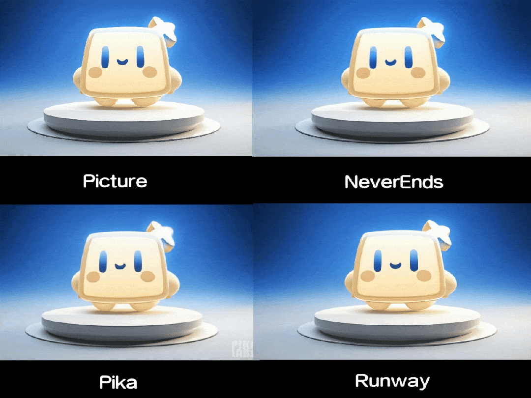 测试小结:Pika这轮很有创意,融入了动画元素,但在视频后期出现了不稳定。Runway转着转着变形了,NeverEnds毫无疑问,应该最符合用户对这个3D形象的简单可动性需求。