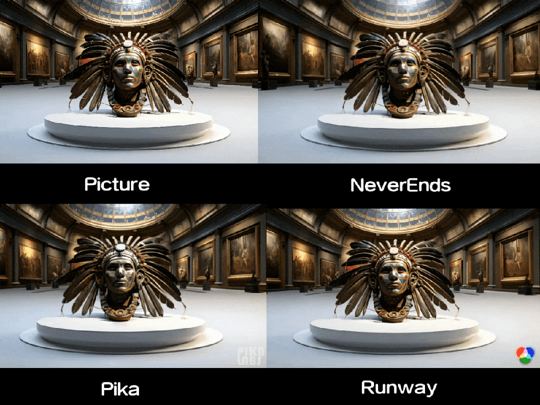 测试小结:NeverEnds采用了一个仰视拉进的效果,而且物体本身没有任何失真与变形。Runway依旧是转着转着变形了,Pika几乎看不到变化。