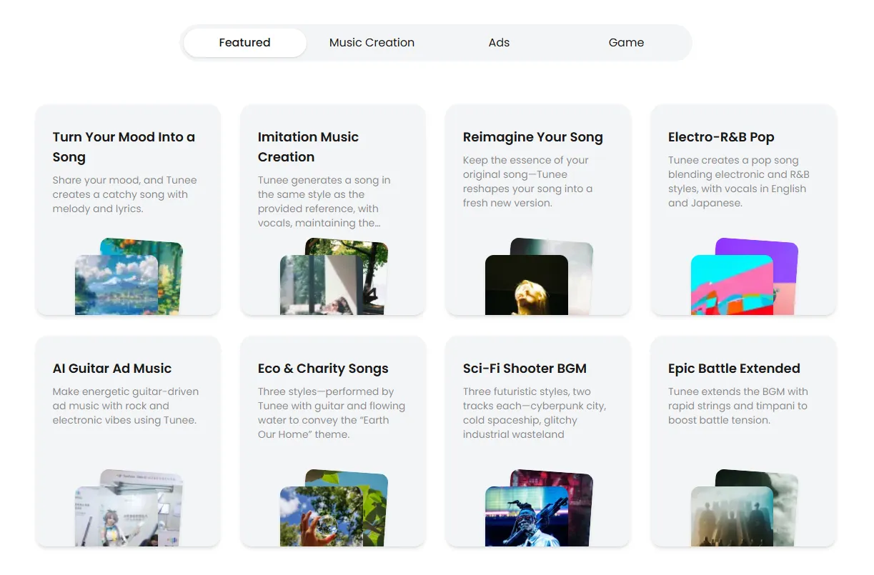 音乐属于每个人,Tunee也是如此。音乐制作人使用Tunee激发灵感并探索新创意方向;内容创作者、电影制作人和广告商依赖 Tunee 快速创建定制配乐;游戏开发者喜爱 Tunee 能生成符合不同游戏场景情绪的音乐;音乐爱好者无需培训,也能用 Tunee 表达音乐想法。无论是专业人士还是音乐爱好者,Tunee 都能适应其水平和需求。