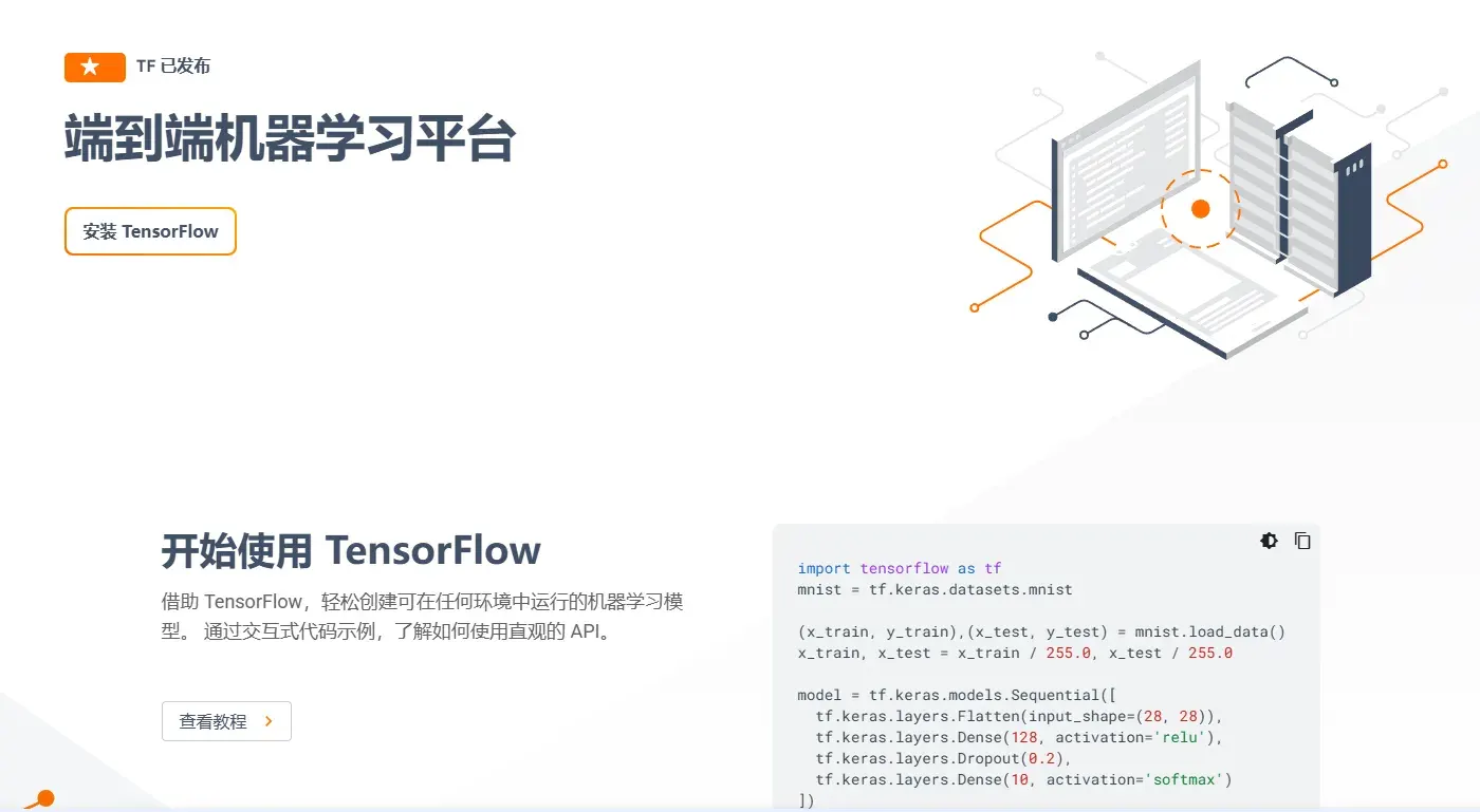 TensorFlow 提供了丰富的 API,使得构建复杂的机器学习模型变得轻而易举。开发者可以使用 TensorFlow 的低级 API(如 tf.Tensor 和 tf.Operation)手动构建计算图,也可以利用 API(如 tf.keras)快速搭建深度学习模型。tf.keras 是 TensorFlow 的 API,它提供了简洁易用的接口,支持快速原型设计和模型构建。例如,以下是一个简单的神经网络模型构建示例: