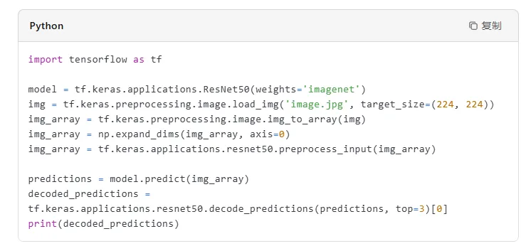 TensorFlow 在图像识别领域有着广泛的应用。例如,通过构建卷积神经网络(CNN),可以实现对图像的分类、检测和分割。TensorFlow 提供了多种预训练模型(如 ResNet、Inception 等),开发者可以基于这些模型进行微调,快速实现的图像识别系统。例如,以下代码展示了如何使用预训练的 ResNet 模型进行图像分类: