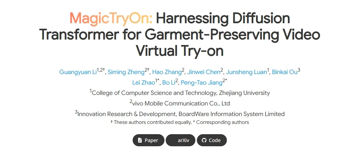 MagicTryOn是由vivo移动通信公司及相关研究机构的研究人员共同提出的一款先进的视频虚拟试穿框架。该框架旨在通过模拟服装在视频中与人体动作的自然互动,展现出服装在动态变化中的真实效果,从而为用户提供更加沉浸式的虚拟试穿体验。视频版AI换衣框架MagicTryOn,基于Wan2.1视频模型研发的。
