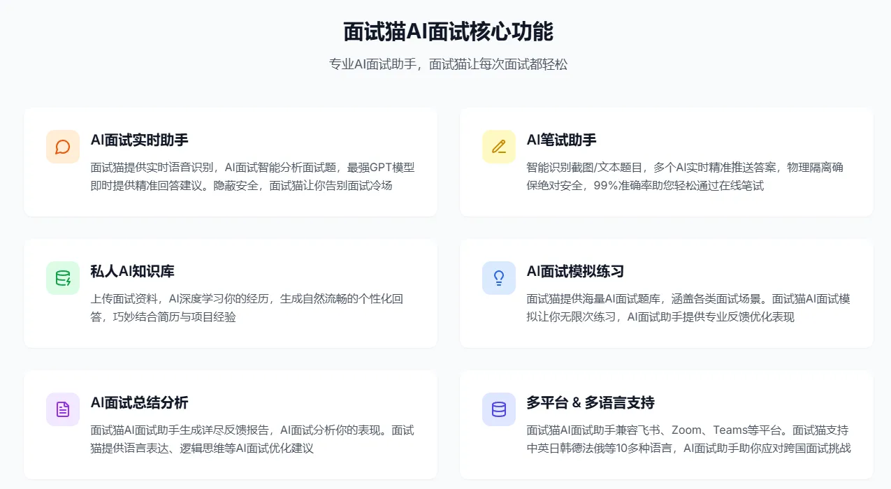 AI总结与提升建议:面试猫不仅能在面试过程中提供实时辅助,还能在面试结束后生成详尽的反馈报告。这些报告从多个维度对求职者的表现进行量化评估,提供具体的提升建议,帮助求职者快速提升面试能力。