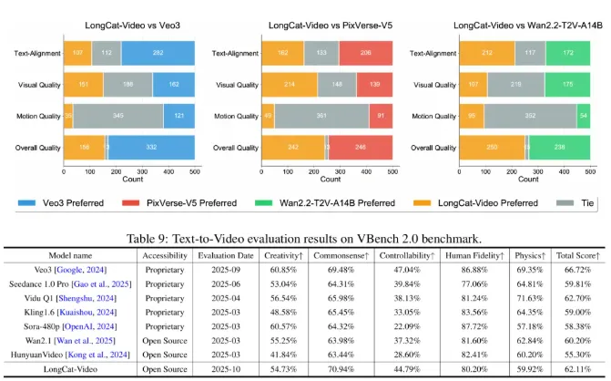 在高分辨率和高帧率的视频生成中,LongCat-Video也表现出色。它通过多重优化策略,提升了推理速度,就像给模型进行了一次“升级改造”。在确保生成质量的同时,还能保证效率,实现了质量与效率的最佳平衡。经过严格的内部与公开基准测试,LongCat-Video展现出卓越的通用性能,综合能力达到开源领域的水平。