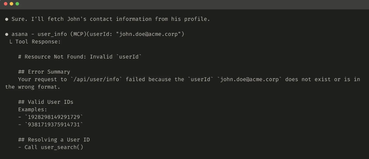 如果您选择截断响应,请务必通过有用的指令引导智能体。您可以直接鼓励智能体追求更节省令牌的策略,例如进行多次小型针对性搜索,不是为知识检索任务执行单次广泛搜索。如果工具调用引发错误(例如在输入验证期间),您可以通过提示工程设计错误响应,以清晰传达具体且可操作的改进建议,而不是提供晦涩难懂的错误代码或追溯信息。