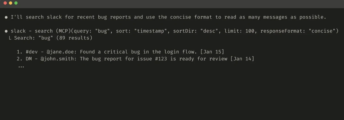在某些情况下,智能体可能需要灵活地同时处理自然语言和技术标识符输出,哪怕只是为触发下游工具调用(例如,search_user(name=’jane’) → send_message(id=12345))。您可以通过在工具中暴露一个简单的response_format枚举参数来实现两者,让智能体控制工具返回”简洁”还是”详细”响应(下图)。