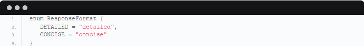 您能添加更多格式以获得更大灵活性,类似于GraphQL,选择确切想要接收的信息片段。以下是一个控制工具响应详细程度的ResponseFormat枚举示例: